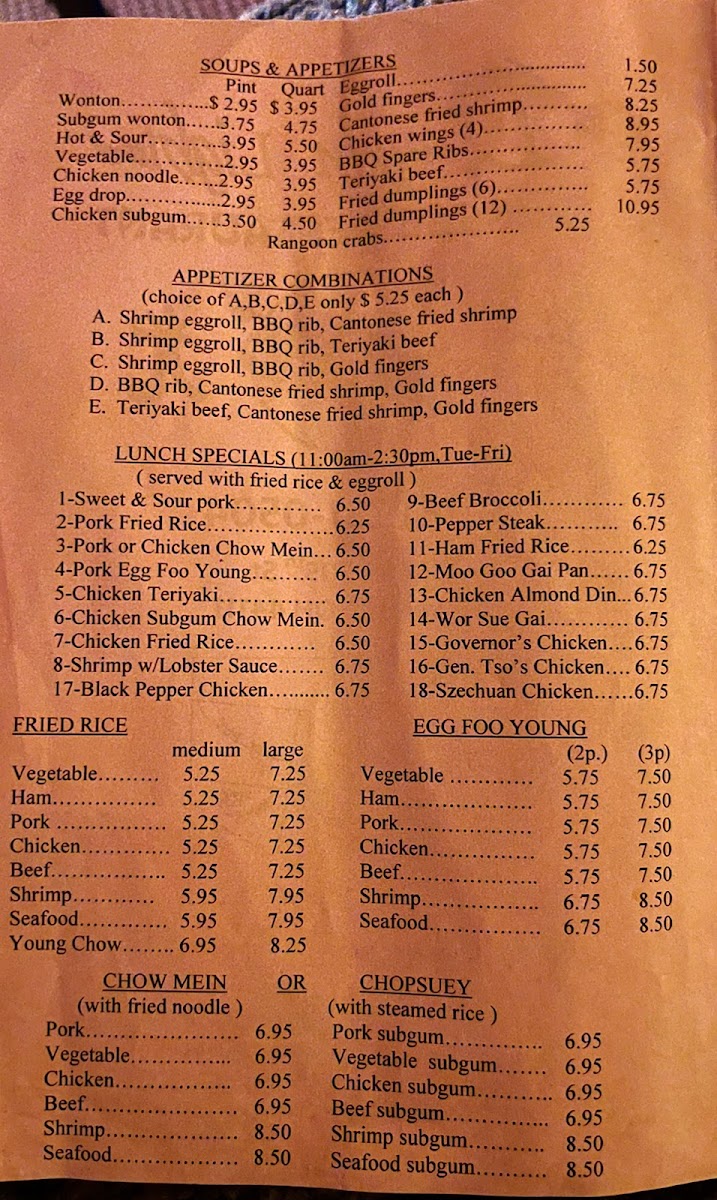 Expect well-rounded options like Orange Chicken Fried Rice, Beef with Broccoli, and the House Special Lo Mein that pair nicely with the calm, unpretentious atmosphere of the restaurant. Light appetizers such as Rangoon Crabs or classic Egg Rolls provide a satisfying start without overwhelming, while combination plates offer a convenient way to sample a balanced mix of favorites including BBQ Pork and Kung Pao Chicken.