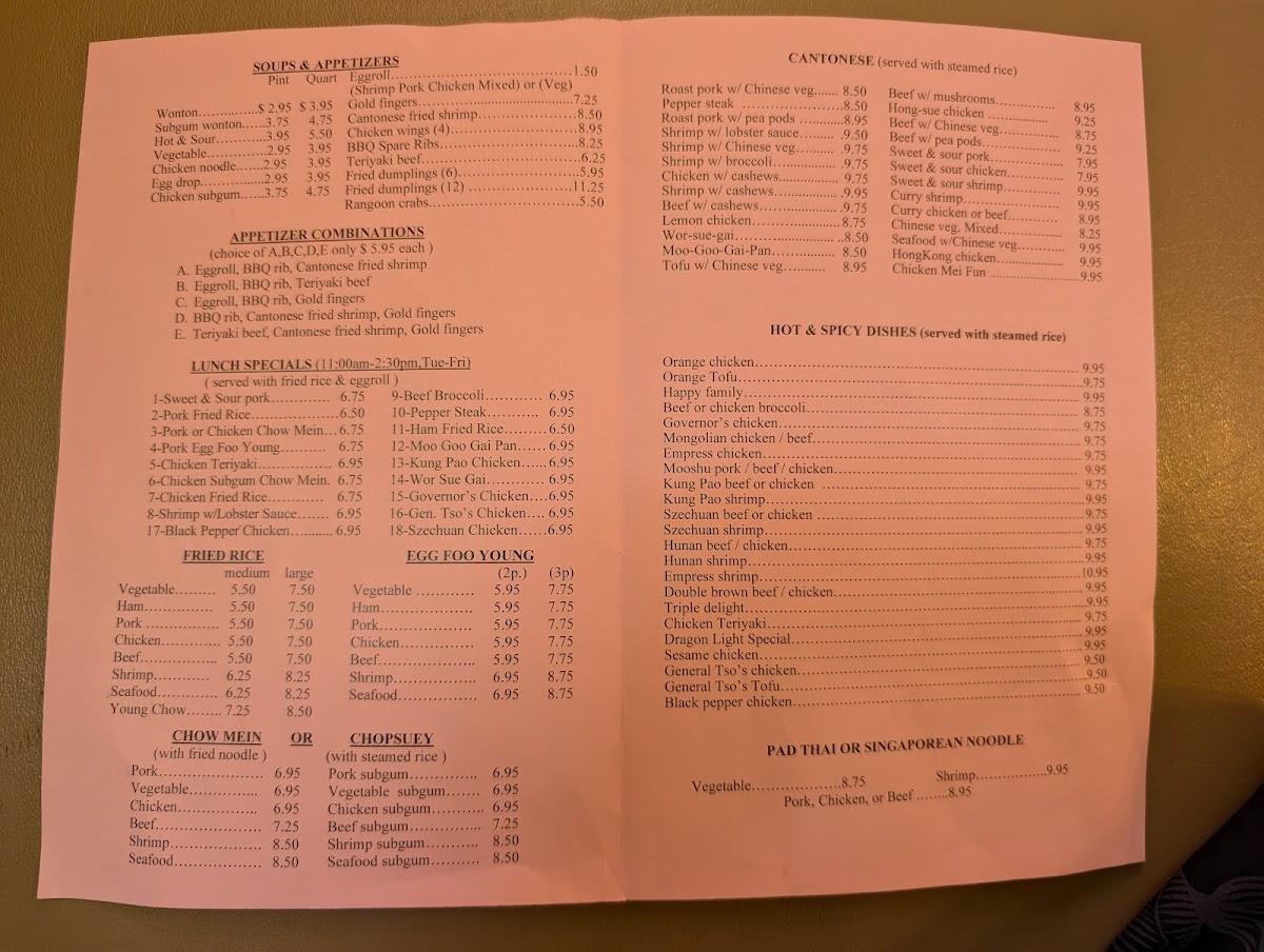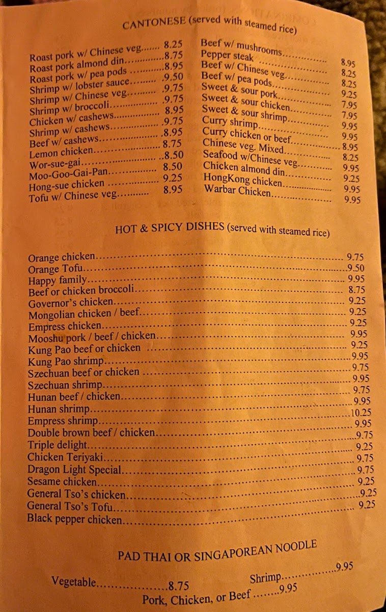 Overall, Dragon Light’s menu reflects an approachable, low-key dining experience where the focus is on genuine flavors and steady quality, fitting well with the calm and quiet setting. It’s a place to enjoy straightforward Chinese favorites without rush, perfect for everyday occasions where comfort food is what you need.